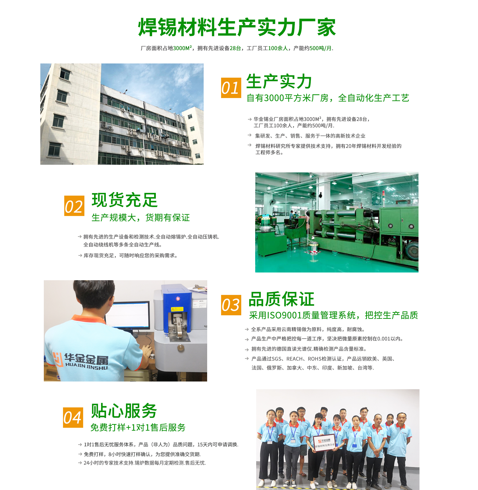 華金錫業(yè)有限公司一家資深的專業(yè)焊錫制品生產(chǎn)廠家,多年專注焊錫制品生產(chǎn)加工。產(chǎn)品有無鉛錫絲.無鉛錫條.錫板.錫膏.錫珠等.公司憑借多年的經(jīng)驗(yàn)和不斷的科技創(chuàng)新.生產(chǎn)的產(chǎn)品各項(xiàng)技術(shù)性能均達(dá)到國家標(biāo)準(zhǔn).歐盟標(biāo)準(zhǔn)。并獲得眾多使用廠家的肯定.為適應(yīng)環(huán)保要求.本公司2003年巨資投入生產(chǎn)無鉛焊錫,多年來連續(xù)通過SGS環(huán)保認(rèn)證.產(chǎn)品規(guī)格齊全,使用性能極佳。客戶群體遍布全國各地及國外用戶。華金錫業(yè)焊錫制品是選用一線品牌作為原材料,采用選進(jìn)的配方,精工制作各種規(guī)格不同的型號(hào),再采用全自動(dòng)流水線作業(yè)擠拉成各種符合要求的焊錫絲和焊錫條。華金牌焊錫制品以其一流的品質(zhì),真誠的服務(wù),產(chǎn)品銷往全國各地,深受廣大用戶的高度贊揚(yáng)。